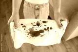 The child spilled coffee on his clothes. The concept of a stain on a t-shirt. Top view.