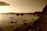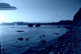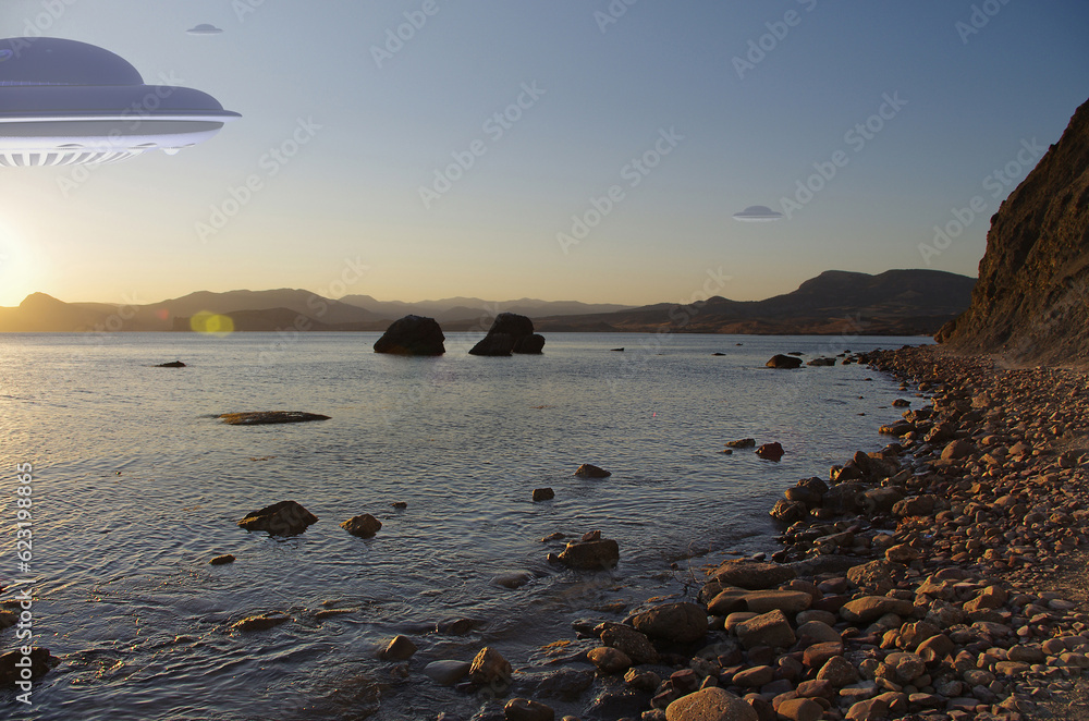 UFO, space saucer flies over the water of a sea or lake. Landscape with invasion by extraterrestrial space object at dawn or dusk.