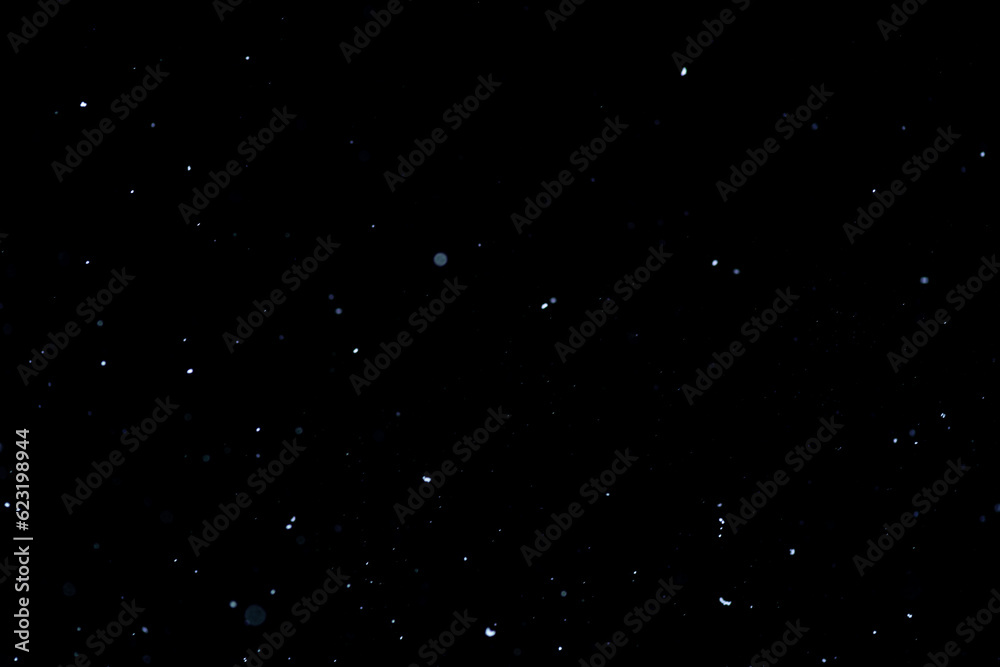 Bokeh effect of snowfall and lights. Abstract blurred background with snowflake in the night sky, White spots and dots in the dark. Snowy stormy weather, falling snow