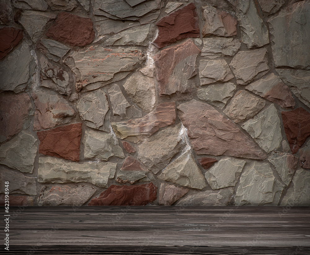 Stone brick walls and wooden floor for mock up. Rustic old wooden planks, shelf or table surface. Empty room background for product displaing and copy space for text