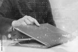 Businessman with laptop analyzes financial market data. Futuristic technology solution for business development. Abstract technological background in vibrant colors with blur.