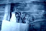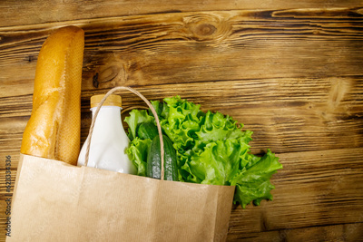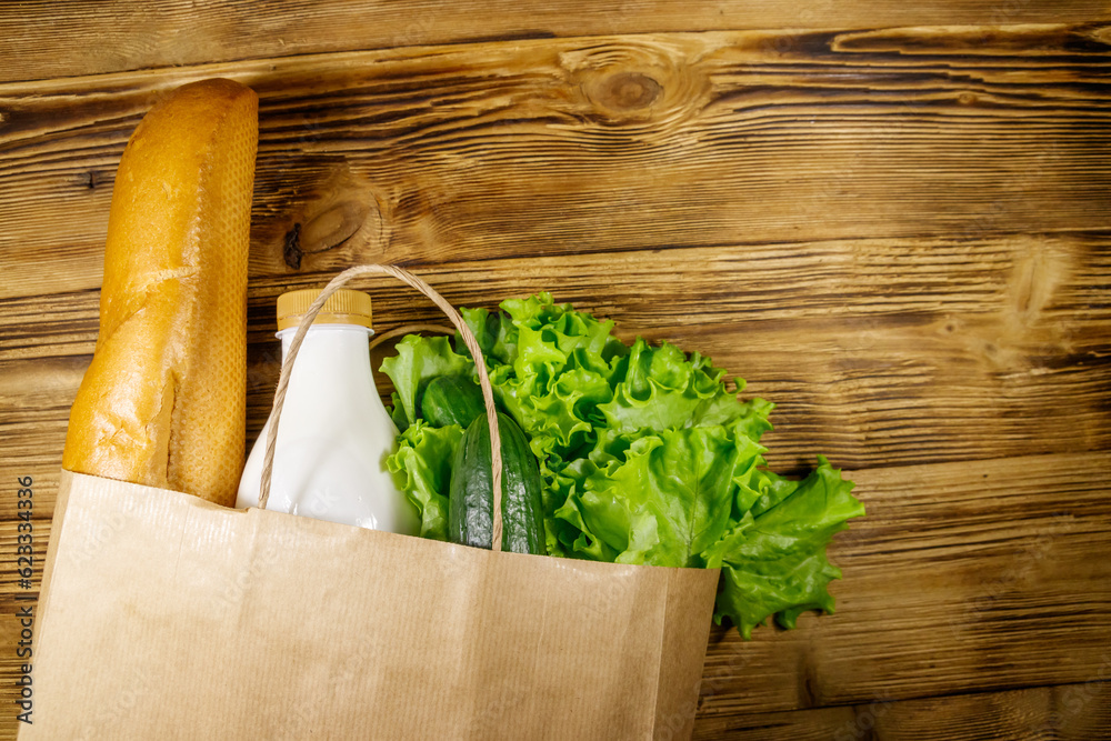 Paper bag with different food on wooden table. Top view. Grocery shopping concept