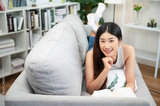 Asian woman happy smile Beautiful Asian woman relaxing reading book in bedroom at home. home relaxation concept