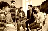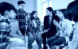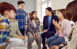 Group of elementary school children sitting in circle during class. Boys and girls students in casual wear sitting on chairs and talking to friendly female teacher in classroom