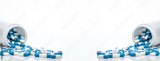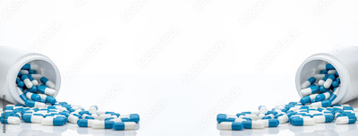Blue-white antibiotic capsule pills spread out of plastic drug bottles. Antibiotic drug resistance. Prescription drugs. Healthcare and medicine. Pharmaceutical industry. Pharmacy product. Medication.
