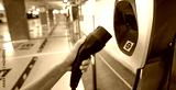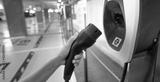 Hand holding electric charger at an electric vehicle charging station. Commercial EV car charging point for charge EV battery. Electric vehicle charging station at basement car parking lot of the mall
