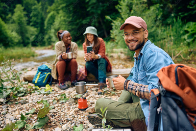 Happy backpacker taking break while hiking with friends in forest and looking at camera.