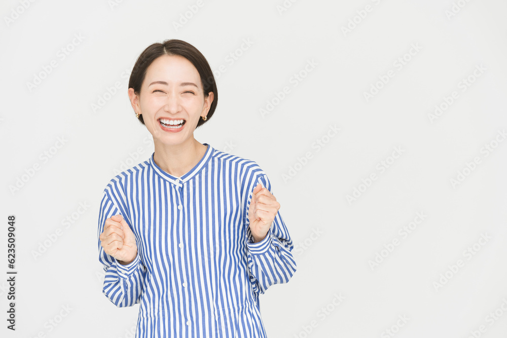 健康的なミドル世代日本人女性/スタジオ撮影白バック/笑顔でガッツポーズをしている