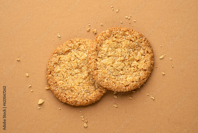 Two oatmeal cookies, top view with copy space