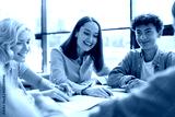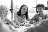 Smiling female teacher having lesson, studying, learning language with school children sitting in classroom or library. Education concept