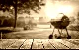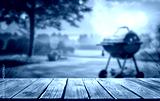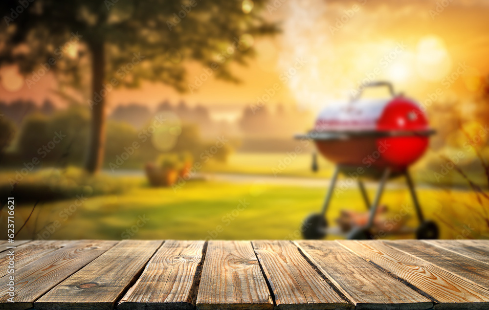 summer time in backyard garden with grill BBQ, wooden table, blurred background