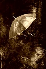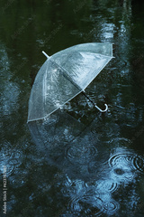 clear umbrella in puddle on road, abstract natural dark background. symbol of rainy season. landscape with umbrella in rainy weather day. template for design. copy space