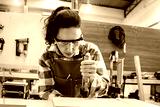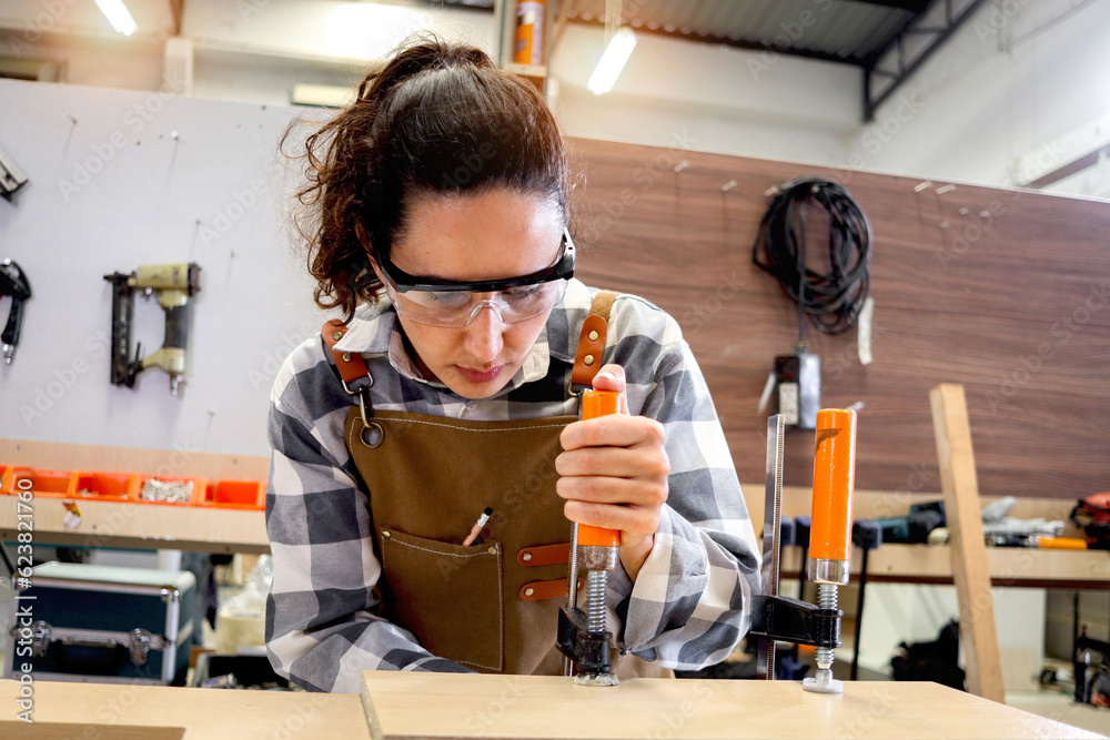 Young beautiful carpenter woman wearing safety glasses goggles and apron, using carpentry tools with wood plank to make wooden furniture in woodworking workshop, female craft worker in carpentry shop.