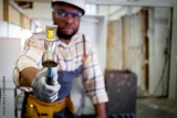 Close-up of hammer in hand of African carpenter wears safety glasses goggles and apron as blurred background, craftsman worker uses carpentry tool to make wooden furniture in woodworking workshop.
