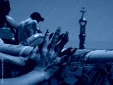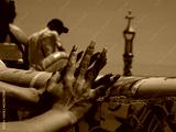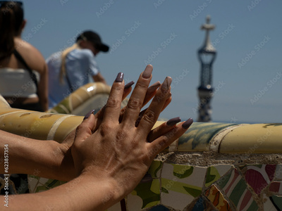 woman hands on ceramic tiles of barcelona park guell spain gaudi masterpiece