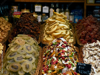 assorted sweets boqueria barcelona fruit seafood meat ham food market