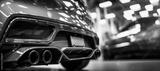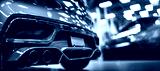 Close up of stainless steel exhaust tip muffler pipe of sports car, bokeh car showroom on background. Dual exhaust at the back of black car with rear defuser.