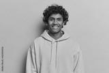 Portrait of handsome curly haired young Hindu man smiles pleasantly dressed in casual hoodie expresses positive emotions poses against blue studio background. Monochrome shot. Youth concept.