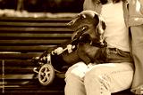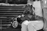 Disabled dachshund dog in a wheel chair sitting on a bench with the owner