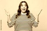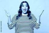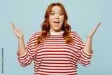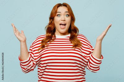 Young shocked surprised chubby overweight woman she wears striped red shirt casual clothes spread hands look camera isolated on plain pastel light blue background studio portrait. Lifestyle concept.