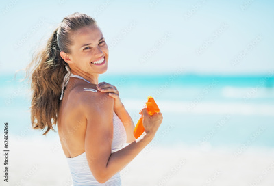 Smiling young woman on beach applying sun block creme
