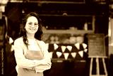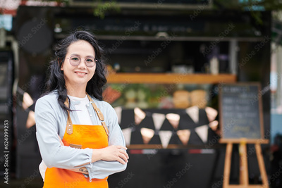 Portrait of smiling Vietnamese vendor in apron standing in front of her food truck