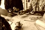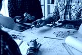 construction site engineer two businessmen Engineering objects in the workplace with engineers and architects working together. Brainstorm ideas and design blueprints using a laptop at work.