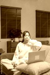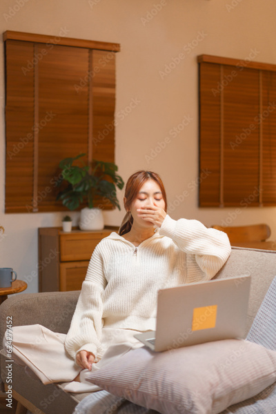 Nightlife concept, Young woman sleepy and yawning while working on laptop at late night in winter