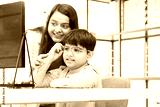 Indian cute child boy trying and choosing new eyeglasses with young optometrist woman or doctor at ophthalmology clinic or optics store, smiling, looking in the mirror, love a glasses frame he wearing