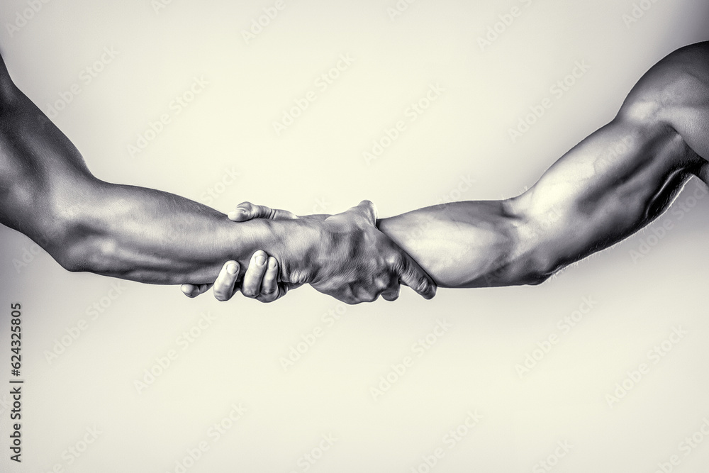 Helping hand concept and international day of peace, support. Closeup. Helping hand outstretched, isolated arm, salvation. Helping arm of a friend, teamwork. Black and white