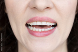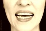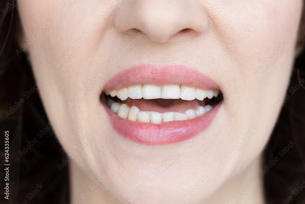 Woman shows off her chipped teeth. Bruxism, stress, malocclusion.