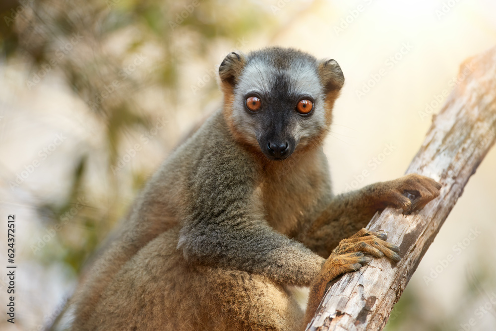 Madagascar wildlife theme: portrait of wild Red-fronted brown lemur, Eulemur rufifrons in natural environment of dry forest of Kirindy, Madagascar. Golden hour, orange eyes contact, close up wildlife.