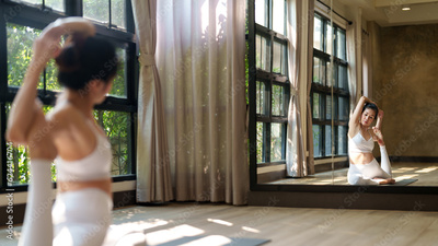 Fitness woman doing yoga exercise stretching on mat yoga, wellbeing lifestyle.