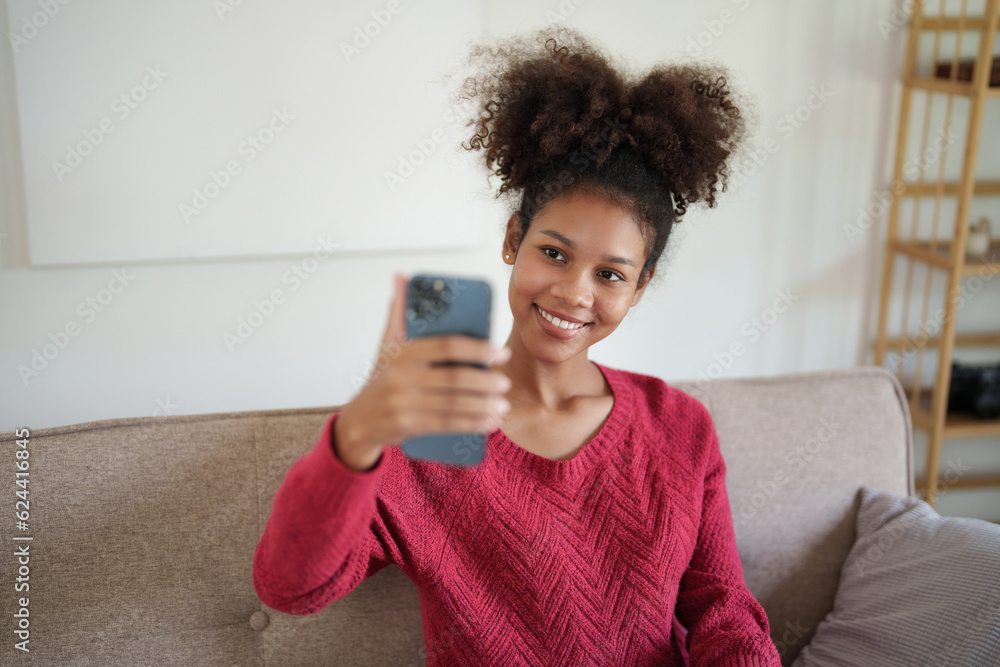 Happy african american woman smiling and taking selfie photo by smartphone camera.