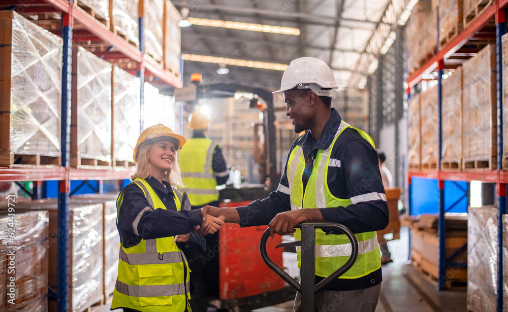 Industry warehouse worker in safety uniform check order details and checking goods supplies on boxes shelve in workplace warehouse industry logistic export import distribution business concept.