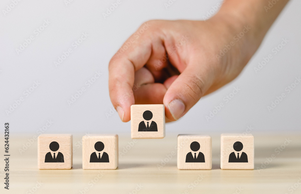 social network of human resources Assessment center concept Personal auditing or CRM concept. Whole team recruiter with one person shown with wooden cubes with icons.