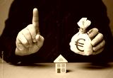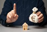 Financial adviser warns about buying real estate. Man with attention sign finger holding euro money bag. Choosing the best mortgage loan terms for real estate purchase. Becoming a homeowner.