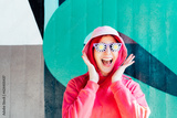 Wow, excited emotional screaming woman in sunglasses with flowers stickers. Playful woman with pink hair,bucket hat and magenta sweatshirt. Vanilla Girl. Kawaii vibe. Candy colors design. Flower mood
