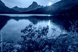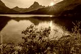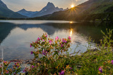 Sticky Geranium on the edge of Swiftcurrent Lake with Mt Wilbur and the setting sun in the background, Many Glacier, Glacier National Park, Montana