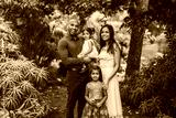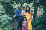 beautiful indian family standing and smiling in the park with trees and greenery