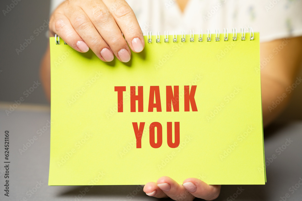 Thank you on notes in female hands. Expressing gratitude, acknowledgment or appreciation concept. Gratitude and appreciation. Feedback
