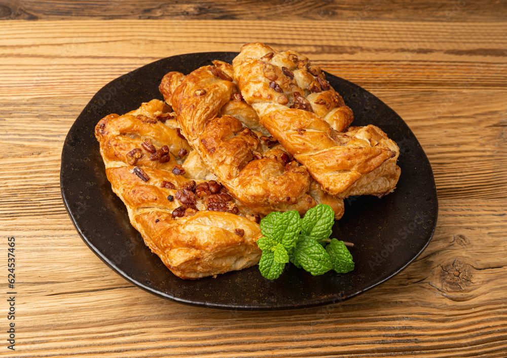 Maple Pecan Puff Pastry, Danish Plaits Pastries with Maple Syrup and Pecan Nuts, Breakfast Bakery