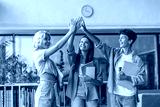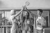Group of happy teenagers, college students holding books, notebooks giving hive five, celebration exam results. Education concept