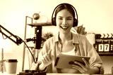 Young Asian woman holding digital tablet and use microphones wear headphones with laptop record podcast interview for radio. Content creator concept.