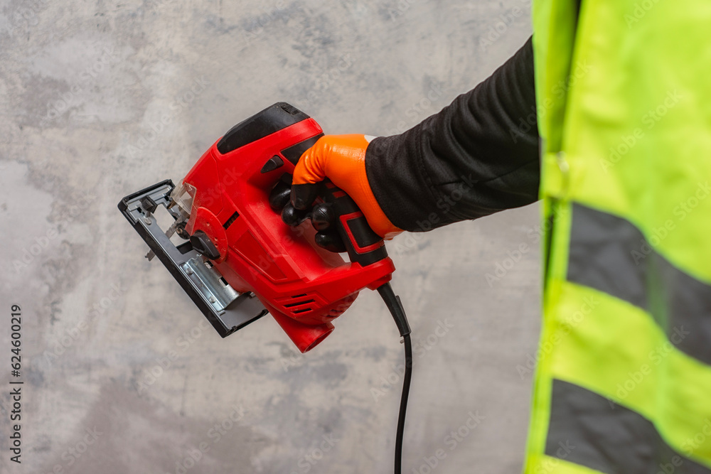 Male worker holds a close-up jigsaw electric in his hands against the background of a concrete wall.