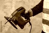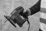 Male worker holds a close-up jigsaw electric in his hands against the background of a concrete wall.