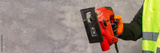 Male worker holds a close-up jigsaw electric in his hands against the background of a concrete wall.