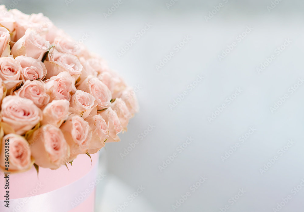 Floral concept. Roses in a bouquet. Flowers in a cylindrical box. Neutral blurred background. Wedding, Birthday, Mother's Day banner. copyspace. mockup.
