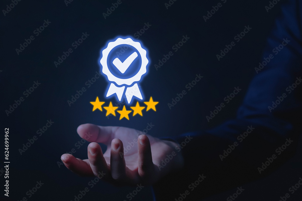 Hand showing quality assurance sign, leading service, certification, quality control, warranty standard, business technology concept.