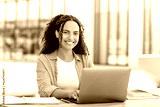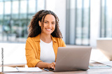 Positive successful female freelancer. Pretty, brazilian or hispanic curly young woman, university student, sitting near campus, with laptop and notebook, preparing for exam, looks at camera, smile